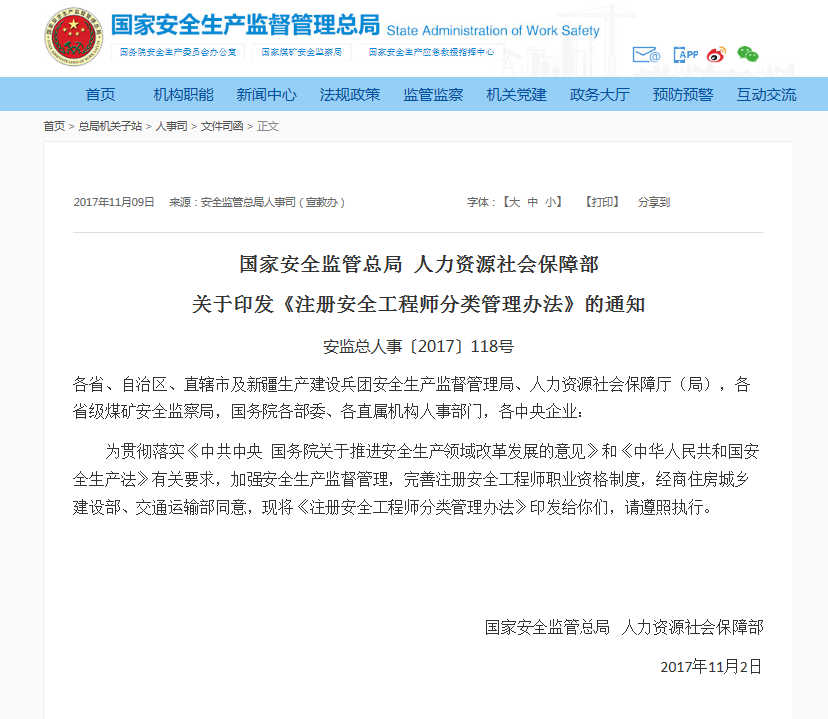 近日,国家安全监管总局和人力资源社会保障部联合发布了《注册安全工程师分类管理办法》(安监总人事〔2017〕118号,以下简称《分类管理办法》)。